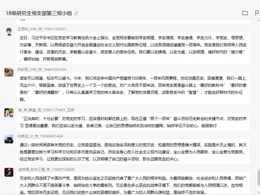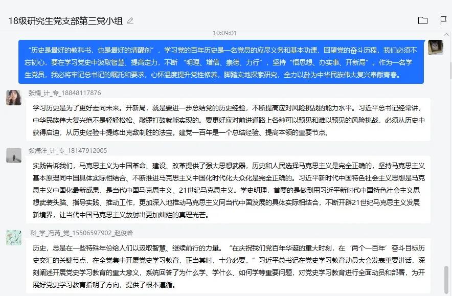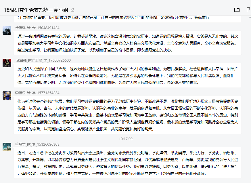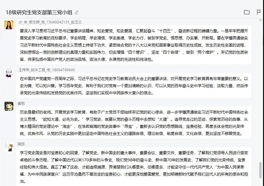 最后,组内党员将学习感悟分享至党小组群内,以史明鉴,坚定初心,谨记总书记要求,学习党史以达到“明理、增信、崇德、力行”。