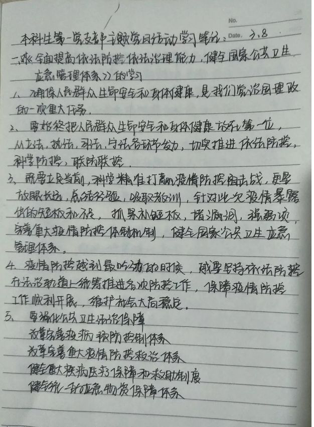 会上,赵琦老师对习近平总书记关于新冠肺炎疫情防控的重要论述、讲话和部署进行了讲解。重点学习了于3月1日在第5期《求是》杂志上发表的题目为《全面提高依法防控依法治理能力,健全国家公共卫生应急管理体系》的文章。